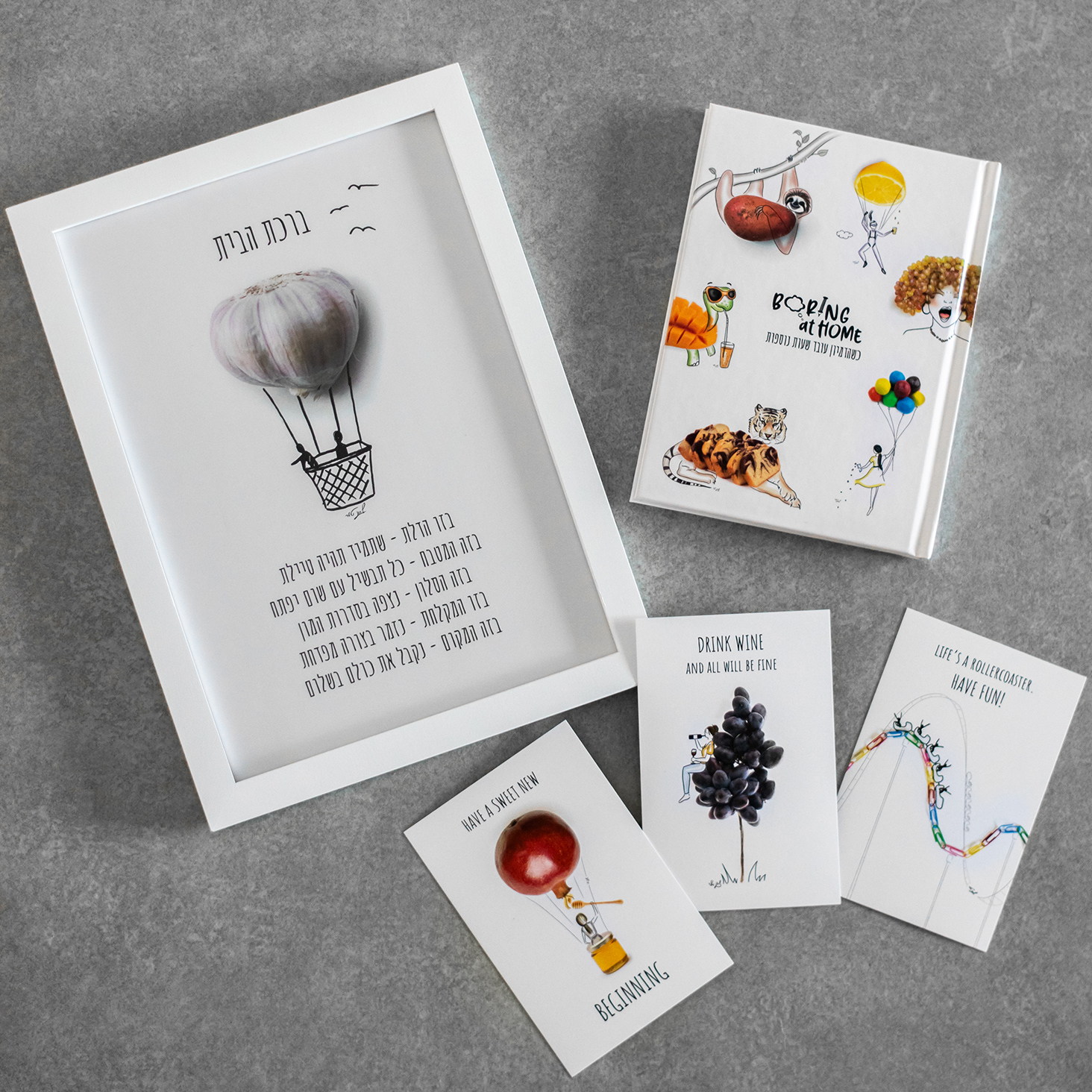 - החפצים/מאכלים באיור הם צילום ולא מודבקים פיזית בתמונה, האיורים מודפסים על נייר איכותי 160 גרם.