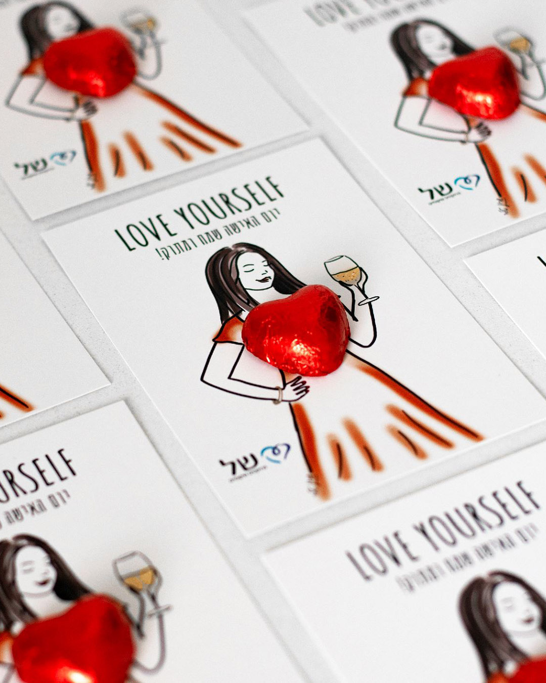 גלויה מאויירת ומקורית עם שוקולד לב המודבק עליה – המוצר היחיד באתר שמשלב חפץ אמיתי כחלק מהעיצוב.