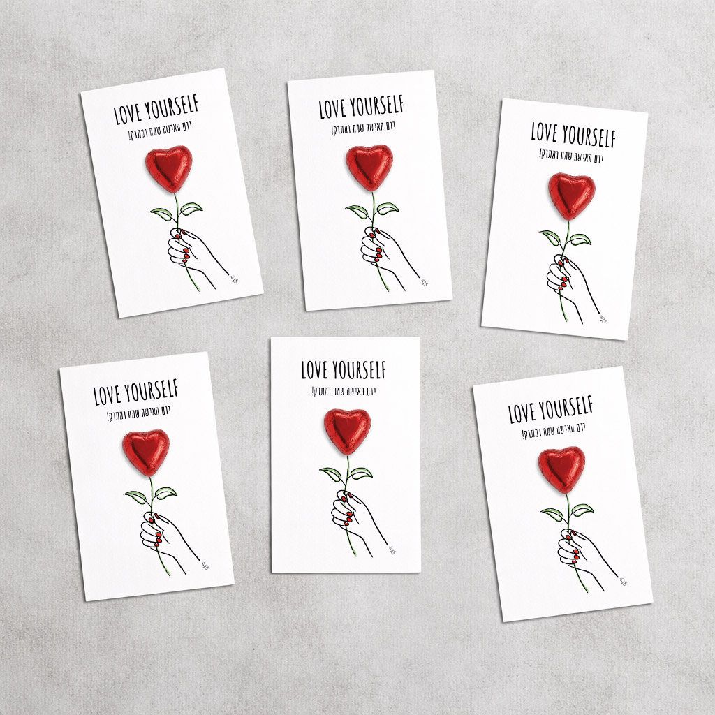 גלויה מאויירת ומקורית עם שוקולד לב המודבק עליה – המוצר היחיד באתר שמשלב חפץ אמיתי כחלק מהעיצוב.